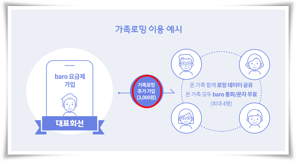 baro요금제 가입 후, 3천원으로 가족로밍 요금제를 추가하면 데이터를 최대 4명의 가족과 공유할 수 있습니다.