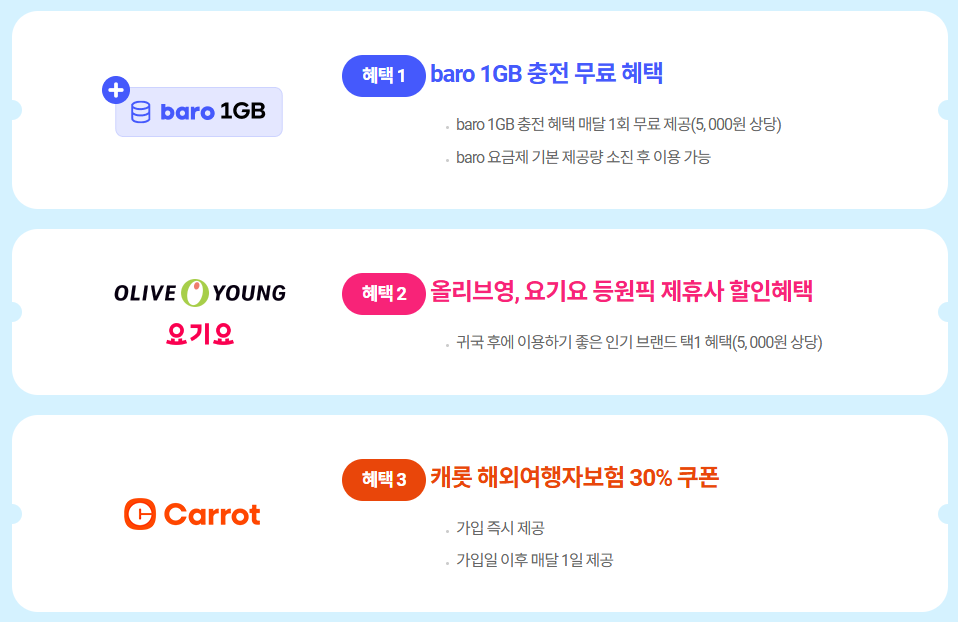 ※ 0 청년 요금제 50% 할인은 baro 요금제 가입 후 로밍 데이터 사용을 시작한 시점에 0 청년 요금제 가입 상태일 경우에만 혜택 제공이 가능합니다.