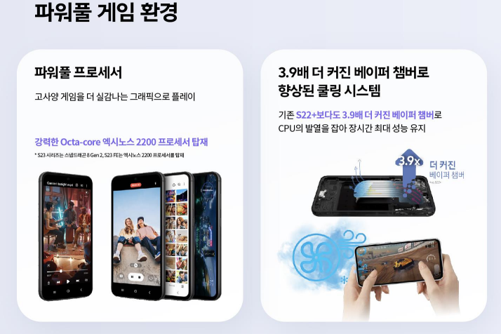 - 기존 S22+보다도 3.9배 더 커진 베이퍼챔버로 CPU발열을 잡아 장시간 성능유지