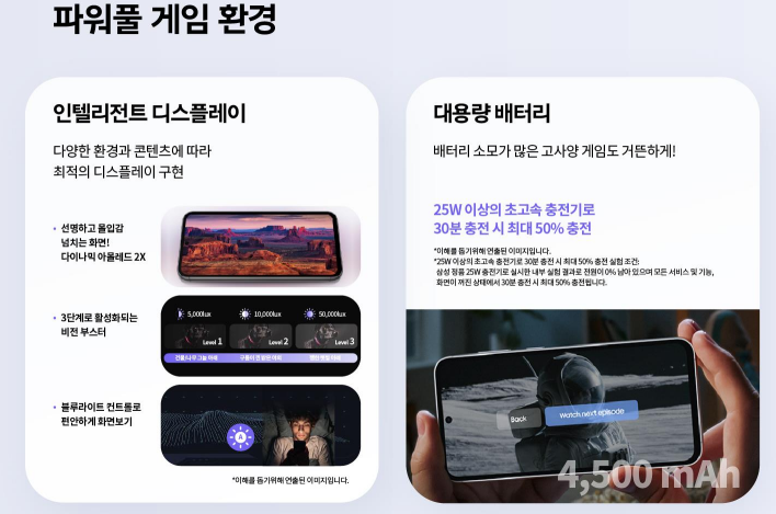 - 대용량 4,500mAh로 고사양게임도 거뜬