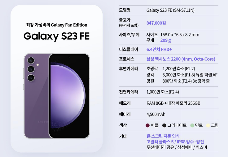 1. 갤럭시 S23Fe 기본 스펙