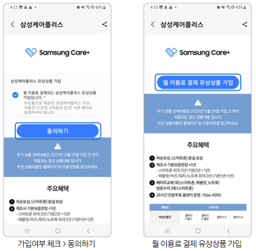 Samsung Members 앱 > 혜택 > 삼성케어플러스 상품 가입하기 > 동의하기 > 월 이용료 결제 유상상품 가입 > 가입하기