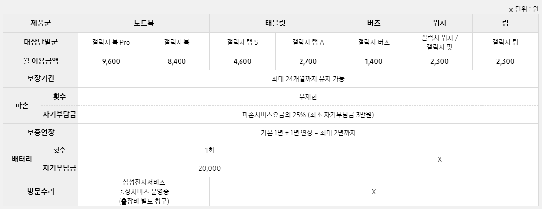 스마트폰은 36개월, 갤럭시 태블릿, 버즈, 워치 등은 24개월 동안 아래 혜택을 받으실 수 있습니다.