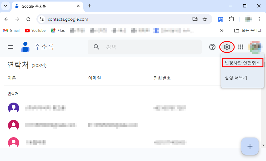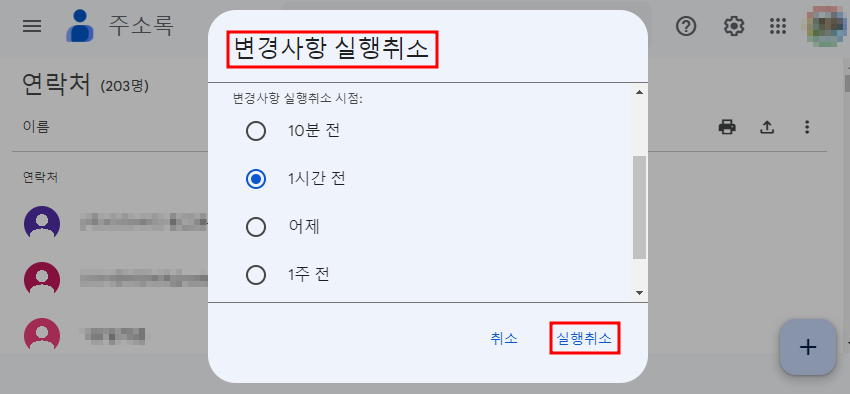 Google접속 후 앱스(오른쪽 상단) > 주소록 > 설정 > 변경사항 실행 취소 > 변경사항 실행취소 시점 선택 > 실행 취소