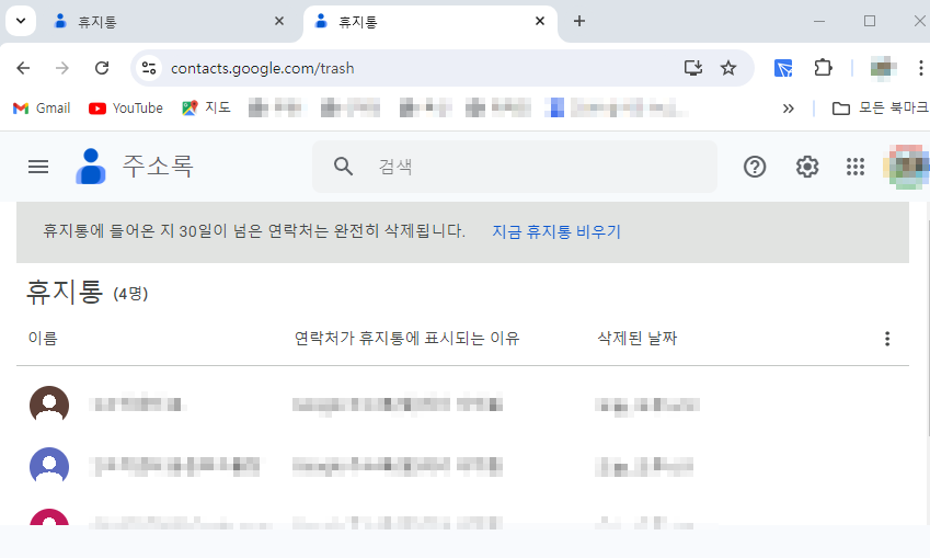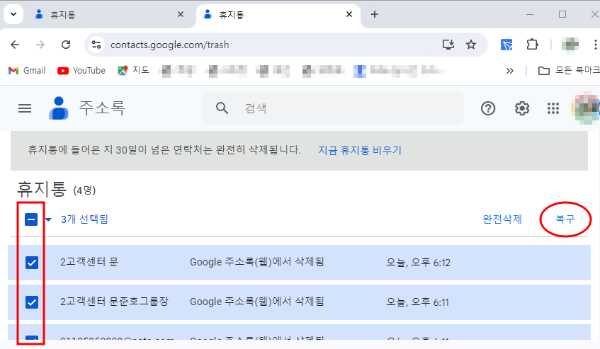 구글 주소록 > 메뉴(왼쪽 상단) > 휴지통 > 복원할 연락처 선택 > 상단 ▼ 선택 > 모두 > 복구