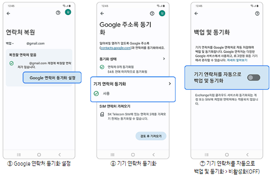 설정 > Google > 설정 및 복원 > 연락처 복원 > Google 연락처 동기화 설정 > 기기 연락처 동기화 > 기기연락처를 자동으로 백업 및 동기화 – 비활성화(OFF)