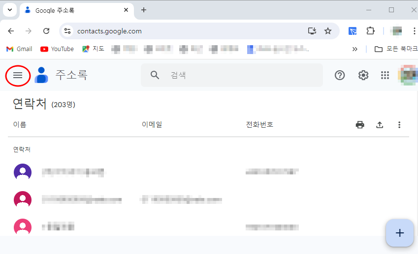 1. 구글 주소록 > 매뉴 (좌측상단 줄3개)
