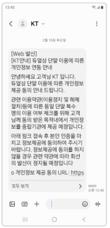 개인정보 제공 미동의 시 (3시간 이후) 이용약관에 따라 명의 일치 확인 불가 사유로 회선이 이용정지 되며 아래의 동의링크를 통해 개인정보조회.수집.이용.제공 동의를 완료해 주시면 자동으로 정지 해제 됩니다.